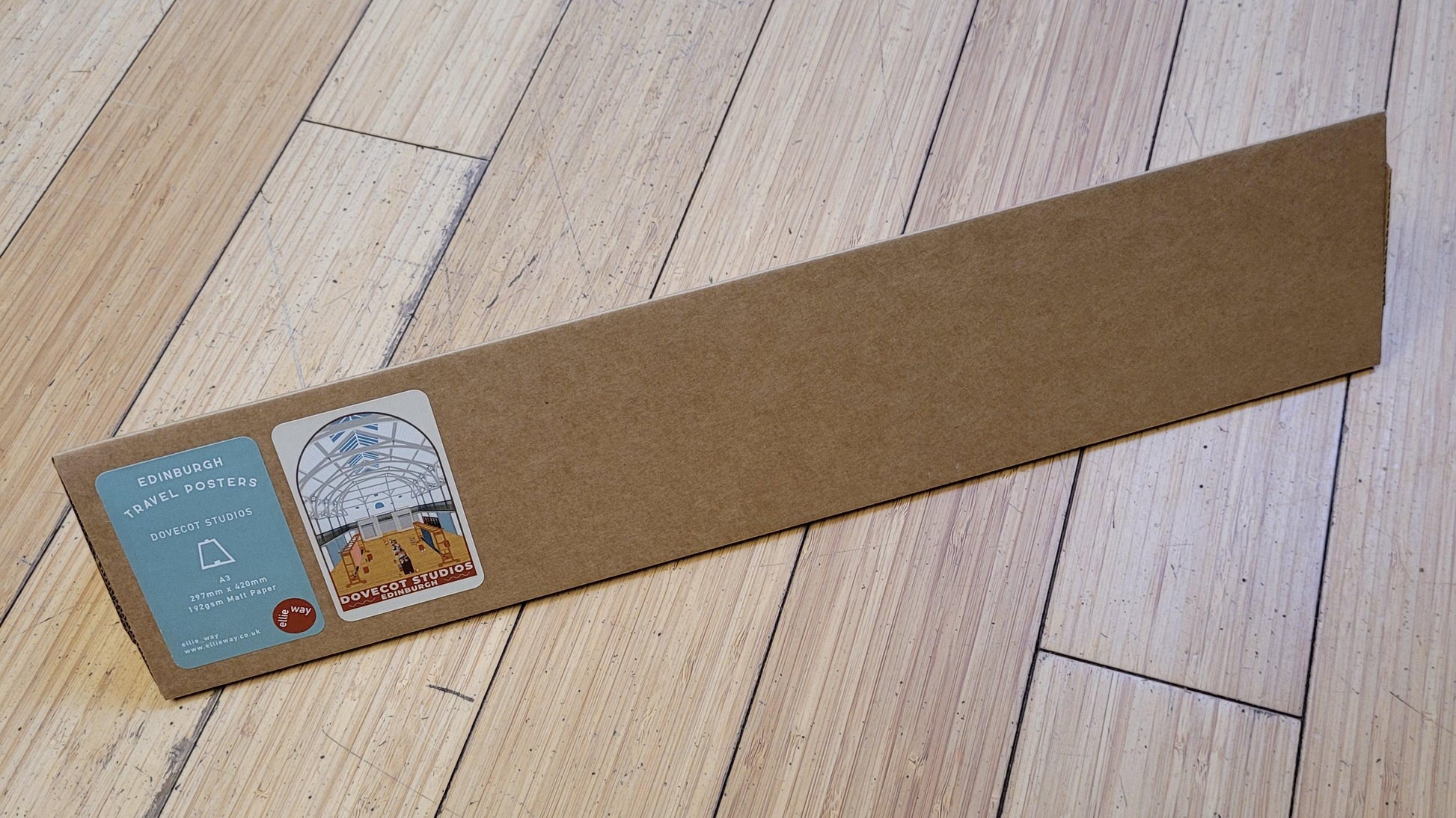 Posters are rolled in tissue paper and packaged in triangular tubes to avoid damage in transit.